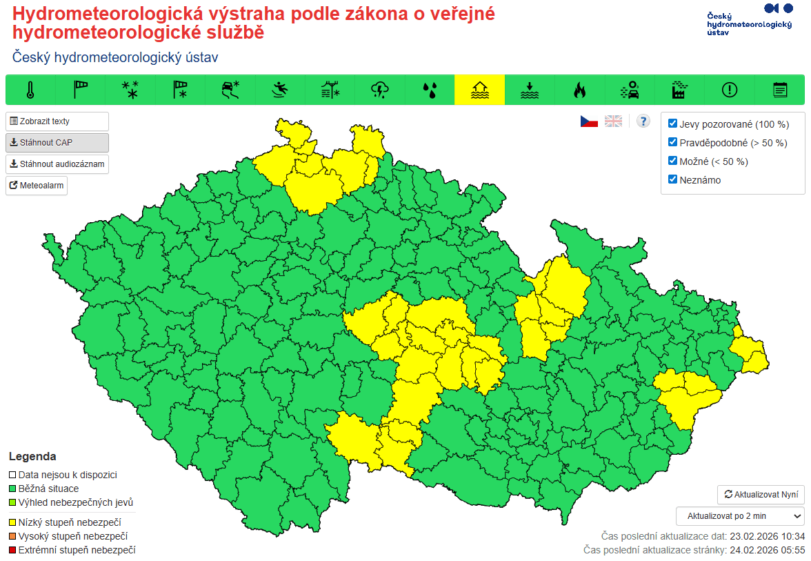 Zatímco západ a střed republiky se probudí do polojasného počasí s teplotami kolem 10 stupňů, Moravskoslezský kraj a část východních Čech zůstanou pod oblačnou přikrývkou. Teploty zde dosáhnou maximálně 4 až 7 °C a místy se objeví přeháňky nebo slabý déšť. V severovýchodní polovině území bude oblačno až zataženo, místy přeháňky nebo déšť, nad 600 metrů srážky smíšené nebo sněhové.